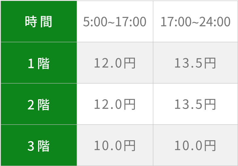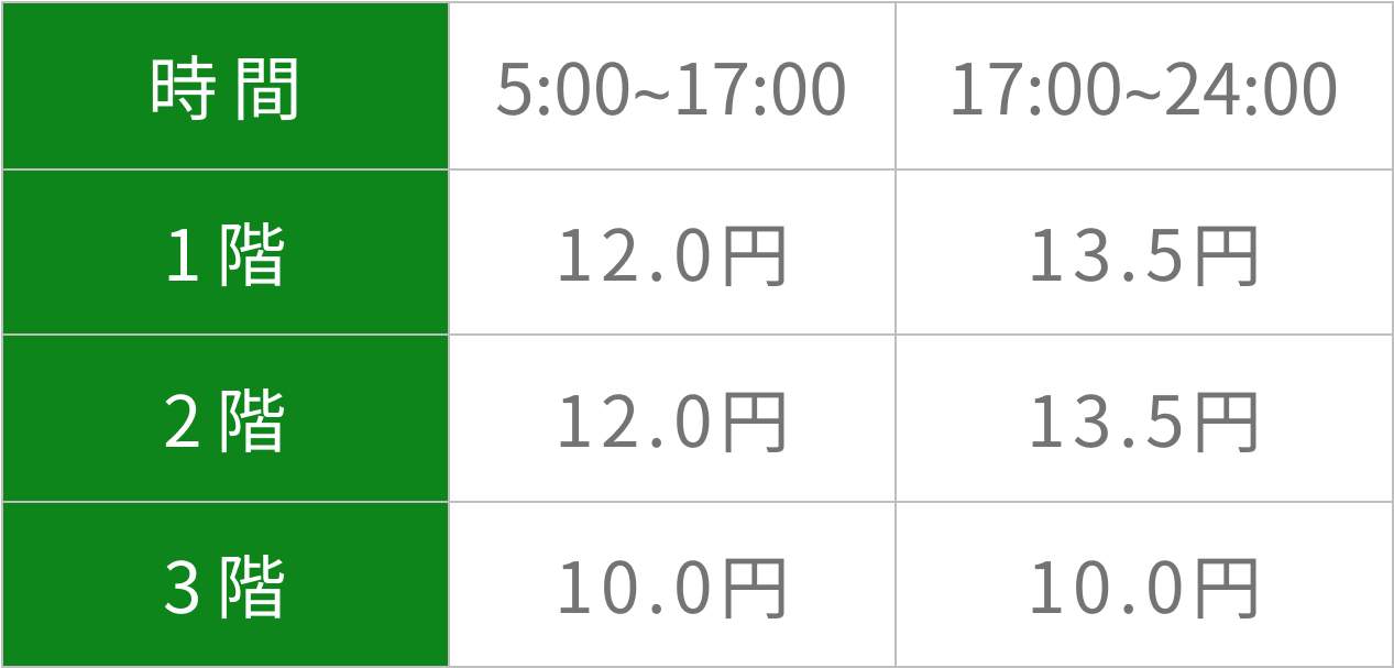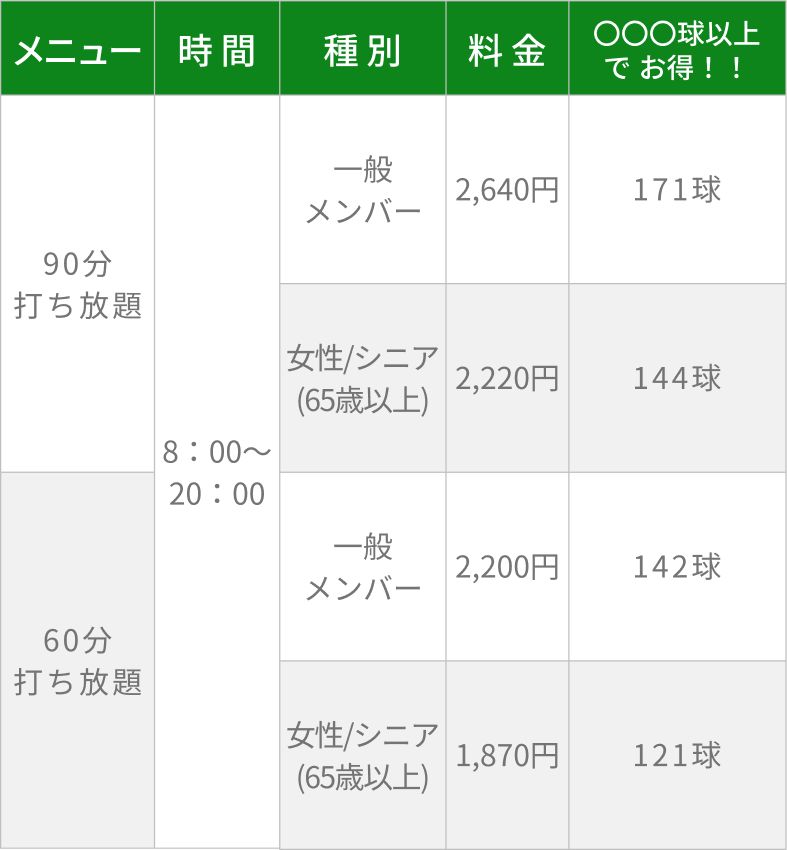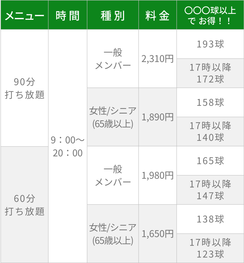 ※以下はメンバー料金です。ビジターは終日メンバー料金より1球あたり2円UPになります。